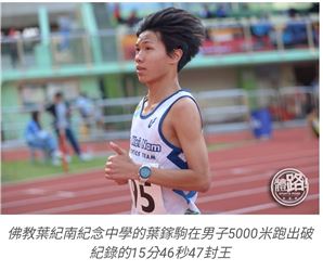 葉鎵駒同學在5000米賽事中不但勇奪冠軍,更以實力刷新大會紀錄。面對全港學界精英雲集的激烈競賽,他仍能力壓群雄,讓各校運動員見證葉紀南「永不放棄」的體育精神。同時,葉鎵駒以「一金一銀」的亮眼表現,令本校在這埸精英賽中成為葵青區中學及佛教中學中表現最優秀的學校,成果令人振奮!